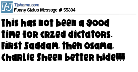 X is This has not been a good time for crzed dictators. First Saddam, then Osama, Charlie Sheen better hide!!!