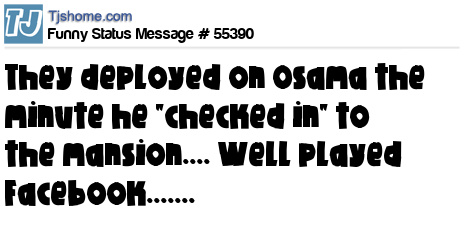X says They deployed on Osama the minute he "checked in" to the mansion.... Well played Facebook.......