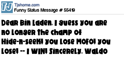 X says Dear Bin Laden, I guess you are no longer the champ of Hide-n-seek! you lose MOFO! you lose! -- I WIN! Sincerely, Waldo