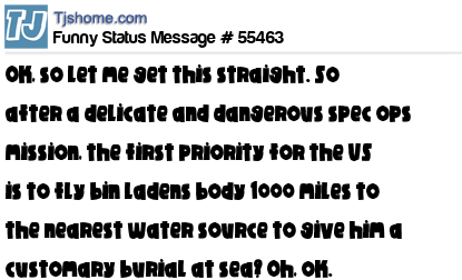 X  Ok, so let me get this straight. So after a delicate and dangerous spec ops mission, the first priority for the US is to fly bin ladens body 1000 miles to the nearest water source to give him a customary burial at sea? Oh, ok.