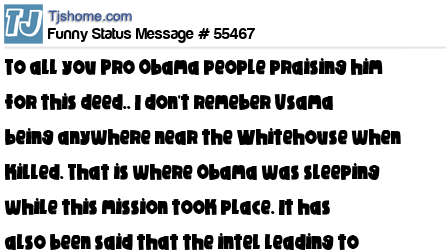 X says To all you Pro Obama people praising him for this deed.. I don't remeber Usama being anywhere near the Whitehouse when killed. That is where Obama was sleeping while this mission took place. It has also been said that the intel leading to his whereabouts