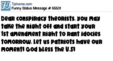 X says Dear conspiracy theorists, you may take the night off and start your 1st amendment right to rant idocies tomorrow, let us patriots have our moment! God bless the U.S!