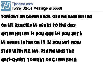 X says Tonight on Glenn Beck. Osama was killed on 5/1, exactly 66 years to the day after Hitler. if you add 5+1 you get 6. 66 years later on 5/1 (6) you get, now stay with me, 666. Osama was the anti-christ, tonight on Glenn Beck.