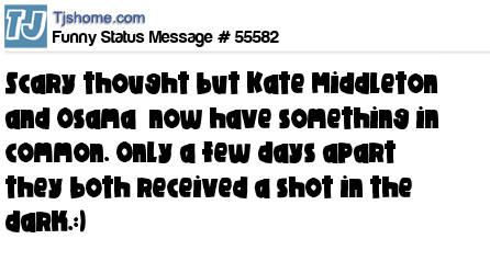 X says Scary thought but Kate Middleton and Osama now have something in common. Only a few days apart they both received a shot in the dark.:)
