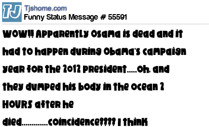 X is WOW!! Apparently Osama is dead and it had to happen during Obama's campaign year for the 2012 president.....oh, and they dumped his body in the ocean 2 HOURS after he died.............coincidence???? I think not!!!