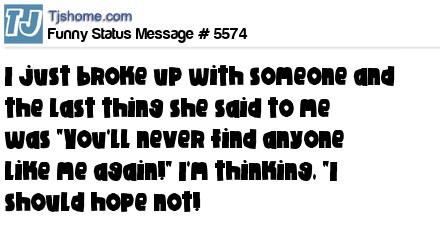 - # 45777 I just broke up with someone and the last thing she said to me was "You'll never find anyone like me again!" I'm thinking, "I should hope not! If I don't want you, why would I want someone like you."