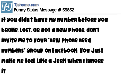 X is If you didn't have my number before you broke, lost, or got a new phone, don't invite me to your "new phone need numbers" group on Facebook. You just make me feel like a jerk when I ignore it