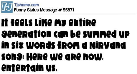 X It feels like my entire generation can be summed up in six words from a Nirvana song: Here we are now, entertain us.
