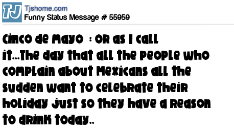 - # 21253 Cinco De Mayo, the only day Mexicans are glad they are Mexican and celebrate for a country they were so eager to leave. So since if you aren't a Mexican today just drink like one!!!