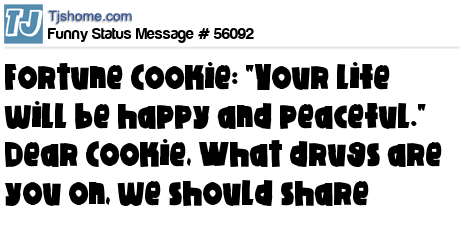 X is Fortune Cookie: "Your life will be happy and peaceful." Dear Cookie, What drugs are you on, we should share
