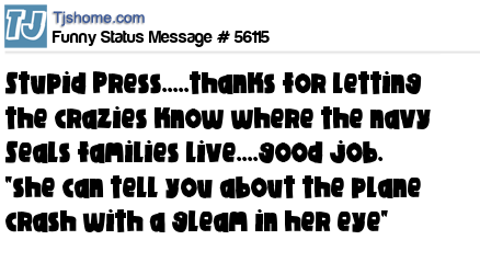 X says Stupid Press.....thanks for letting the crazies know where the navy Seals families live....good job. "she can tell you about the plane crash with a gleam in her eye"