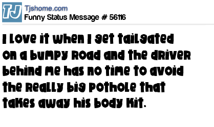 X is i love it when I get tailgated on a bumpy road and the driver behind me has no time to avoid the really big pothole that takes away his body kit.