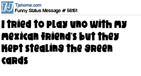 - # 12127 annoyed that he can't play UNO. The Mexican's keep stealing my green cards.