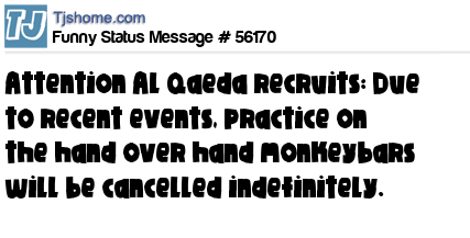 X Attention Al Qaeda recruits: Due to recent events, practice on the hand over hand monkeybars will be cancelled indefinitely.