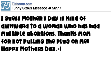 X says I guess Mother's Day is kind of awkward to a woman who has had multiple abortions. Thanks mom for not pulling the plug on me! Happy Mothers Day. :)