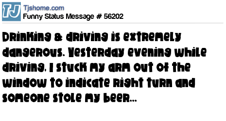 X says Drinking & driving is extremely dangerous. Yesterday evening while driving, I stuck my arm out of the window to indicate right turn and someone stole my beer...