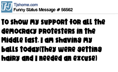 X To show my support for all the democracy protesters in the Middle East, I am shaving my balls today(They were getting hairy and I needed an excuse)