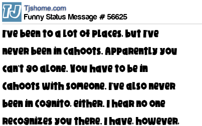 X says I've been to a lot of places, but I've never been in Cahoots. Apparently you can't go alone. You have to be in Cahoots with someone. I've also never been in Cognito, either. I hear no one recognizes you there. I have, however, been in Sane. They don't hav