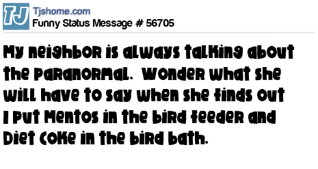 X My neighbor is always talking about the paranormal. Wonder what she will have to say when she finds out I put Mentos in the bird feeder and Diet Coke in the bird bath.