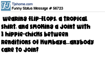 X is wearing flip-flops, a tropical shirt, and smoking a joint with 3 hippie-chicks between renditions of kumbaya...anybody care to join?