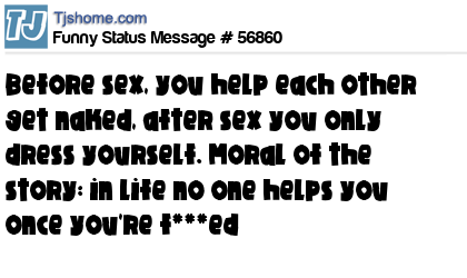 - # 69584 Before sex, you help each other get naked.. After sex, you only dress yourself.. Moral of the story: In life, no one helps you once your f*cked!