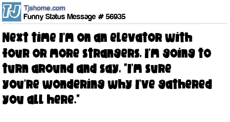 - # 101124 Try this: Get in a elevator with a bunch of strangers make sure you'r closest to the door,then turn and say, "I'm sure you'r all wondering why I gathered you here."