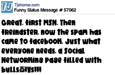 X says Great, first MSN. Then freindster, now the spam has came to facebook. Just what everyone needs, a Social Networking page filled with bulls^!Ys!!!