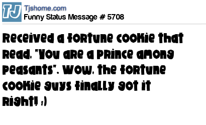 X received a fortune cookie that read, "You are a prince among peasants". Wow, the fortune cookie guys finally got it right! ;)