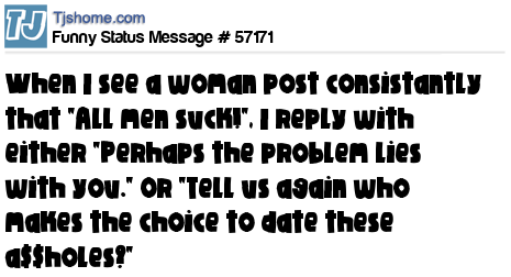 X says When I see a woman post consistantly that "All men suck!", I reply with either "Perhaps the problem lies with you." Or "Tell us again who makes the choice to date these a$$holes?"