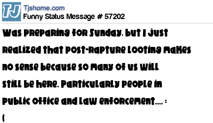 X says was preparing for Sunday, but I just realized that post-rapture looting makes no sense because so many of us will still be here. Particularly people in public office and law enforcement.... : (