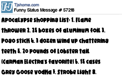 X Apocalypse shopping list: 1. Flame thrower 2. 25 boxes of aluminum foil 3. Pogo stick 4. 3 dozen wind up chattering teeth 5. 20 pounds of Lobster tail (Carman Electra's favorite) 6. 15 cases Grey Goose vodka 7. Strobe light 8. Disco Ball