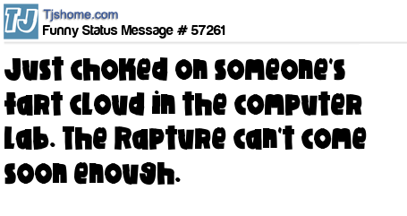 X Just choked on someone's fart cloud in the computer lab. The Rapture can't come soon enough.