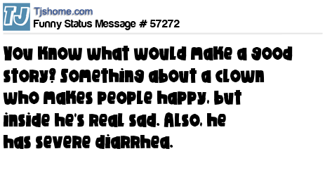 X You know what would make a good story? Something about a clown who makes people happy, but inside he's real sad. Also, he has severe diarrhea.