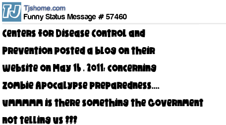 X  Centers for Disease Control and Prevention posted a blog on their website on May 16 , 2011; concerning Zombie Apocalypse preparedness.... ummmmm is there something the Government not telling us ???
