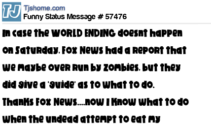 X is in case the WORLD ENDING doesnt happen on Saturday, Fox News had a report that we maybe over run by Zombies, but they did give a 'guide' as to what to do. Thanks Fox News....now I know what to do when the undead attempt to eat my brain.....