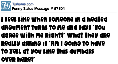 - # 83555 when someone in a heated argument turns to me and says "You agree with me right?" What they are really asking is "Am I going to have to yell at you like this dumba$$ over here?"