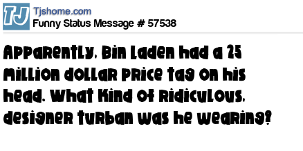 X says Apparently, Bin Laden had a 25 million dollar price tag on his head. What kind of ridiculous, designer turban was he wearing?