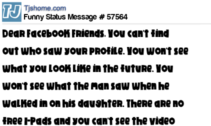 X says Dear Facebook Friends, You can't find out who saw your profile. You won't see what you look like in the future. You won't see what the man saw when he walked in on his daughter. There are no free I-Pads and you can't see the video of Osama's death on face