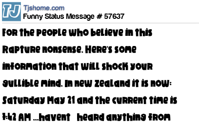 X is For the people who believe in this Rapture nonsense. Here's some information that will shock your gullible mind. In new Zealand it is now: Saturday May 21 and the current time is 7:42 AM ...havent heard anything from them yet.