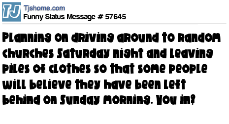 X is planning on driving around to random churches Saturday night and leaving piles of clothes so that some people will believe they have been left behind on Sunday morning. You in?