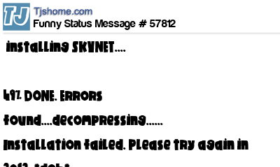 X is installing SKYNET.... ████████████░░░░░░░░░ 49% DONE. Errors found....decompressing...... Installation failed. Please try again in 2012. *doh*