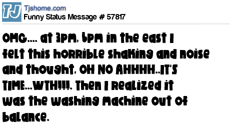 X says OMG.... at 3pm, 6pm in the east I felt this horrible shaking and noise and thought, OH NO AHHHH..IT'S TIME...WTH!!!. Then I realized it was the washing machine out of balance.