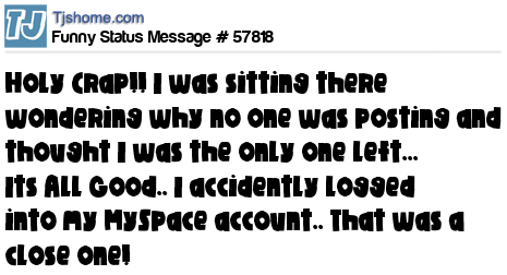 X is Holy Crap!! I was sitting there wondering why no one was posting and thought I was the only one left... Its All Good.. I accidently logged into my MySpace account.. That was a close one!