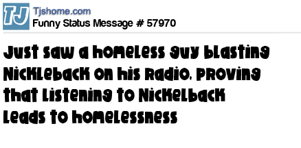- # 100759 Just saw a homeless guy wearing a Nickelback shirt. Further proof that listening to Nickelback leads directly to homelessness.