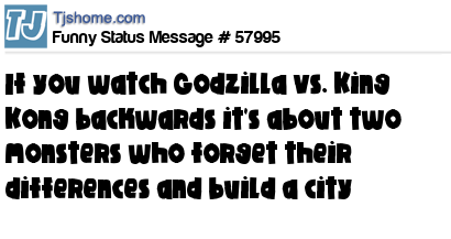 - # 193586 If you watch Godzilla vs King Kong backwards it's about two monsters who forget their differences and build a city.