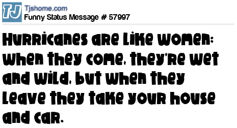 - # 17281 Hurricanes are like women : when they come, they're wet and wild, but when they leave they take your house and car.