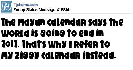 - # 48293 I heard that the world is going to end in 2012, because that's only as far as the Mayan calendar goes. But the news gets even worse: I checked MY calendar, and it only goes to the end of this year!"