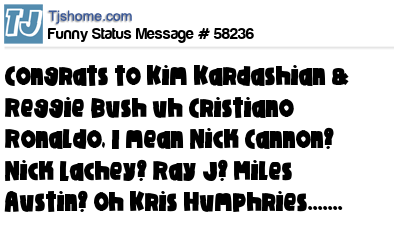 X says Congrats to Kim Kardashian & Reggie Bush uh Cristiano Ronaldo, I mean Nick Cannon? Nick Lachey? Ray J? Miles Austin? Oh Kris Humphries.......