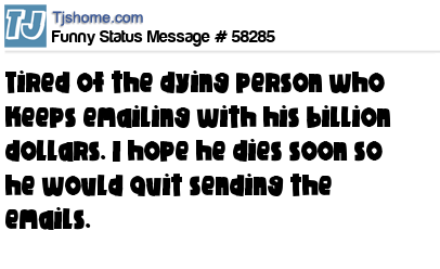 X is Tired of the dying person who keeps emailing with his billion dollars. I hope he dies soon so he would quit sending the emails.
