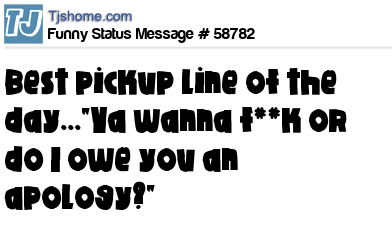 X best pickup line of the day..."Ya wanna f**k or do I owe you an apology?"